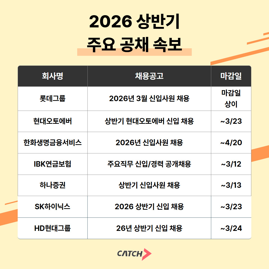 채용 플랫폼 진학사 캐치는 최근 주요 대기업과 금융·IT 기업을 중심으로 2026년 상반기 신입 채용 공고가 잇따라 공개되고 있다고 밝혔다. 현재 채용을 진행 중이거나 일정이 발표된 기업으로는 롯데그룹, 현대오토에버, 한화생명금융서비스, IBK연금보험, 하나증권, SK하이닉스, HD현대그룹 등이 포함된다.