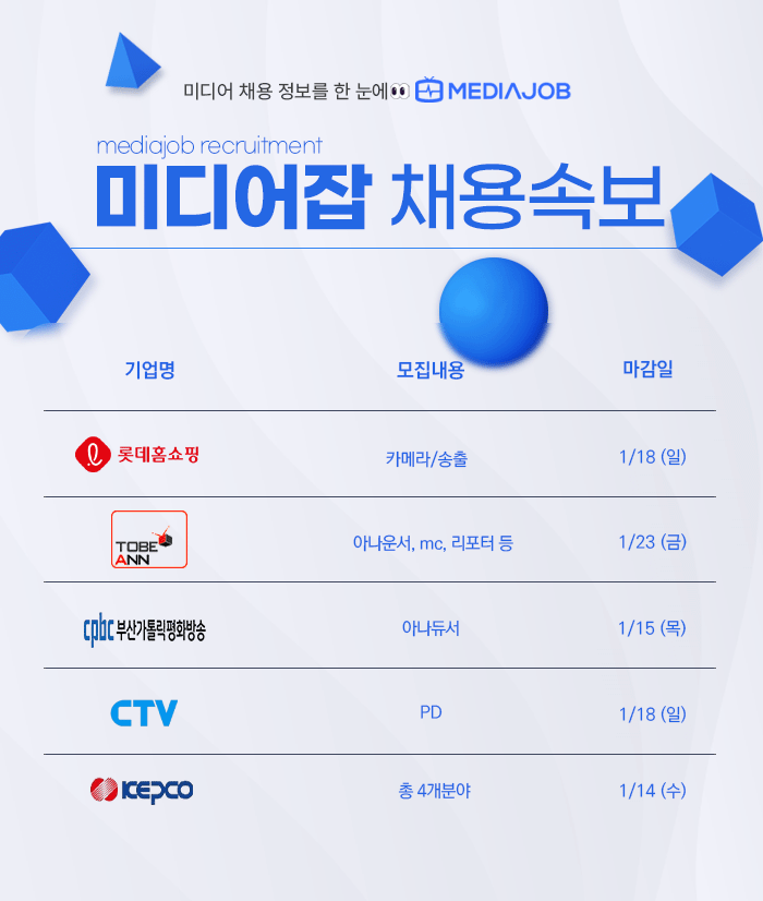 롯데홈쇼핑·투비앤아나운서아카데미·cpbc·CTV·한전 등 1월 방송·공기업 채용 잇따라