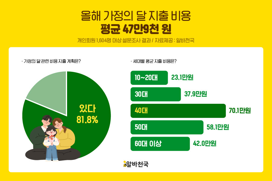 구인·구직 아르바이트 플랫폼 알바천국은 개인회원 1604명을 대상으로 조사한 결과 올해 가정의 달 예상 지출 비용이 평균 47만9000원으로 집계됐다고 29일 밝혔다.