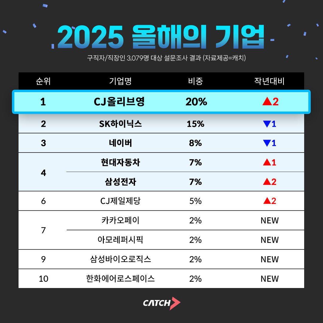 진학사 캐치가 공개한 올해의 기업 조사에서 CJ올리브영은 K-뷰티 산업 성장세를 등에 업고 처음으로 1위를 차지하며 전통 강자인 삼성전자·SK하이닉스를 넘어섰다.
