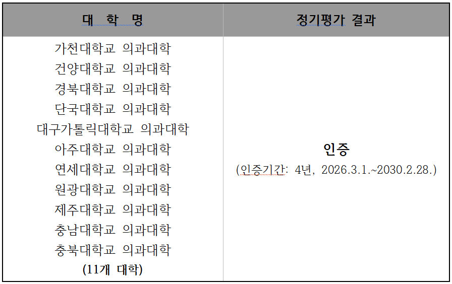 정기평가는 가천대, 건양대, 경북대, 단국대, 대구가톨릭대, 아주대, 연세대, 원광대, 제주대, 충남대, 충북대 등 11개 의과대학을 대상으로 실시됐으며, 모두 인증기준을 충족해 2026년 3월 1일부터 2030년 2월 28일까지 4년간 인증을 받게 됐다. 이 가운데 10개 대학은 기존 인증기간이 2026년 2월 28일 만료 예정이었고, 1개 대학은 2024년 중간평가에서 인증유형 변경이 유예돼 만료 전 재평가를 신청했다.