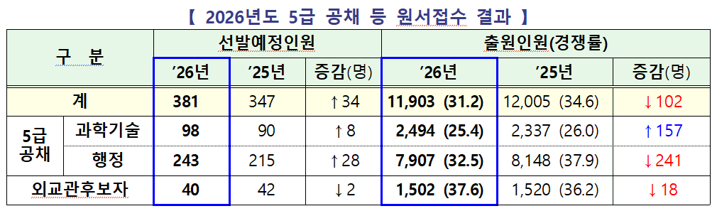 인사혁신처는 24일 2026년도 5급 공채 및 외교관후보자 선발시험 응시원서 접수 결과를 발표하고, 총 381명 선발에 1만1,903명이 지원해 평균 경쟁률이 31.2대 1을 기록했다고 밝혔다. 이는 지난해 34.6대 1에서 3.4포인트 낮아진 수치로, 2022년 이후 매년 이어진 하락 흐름이 올해도 계속됐다.