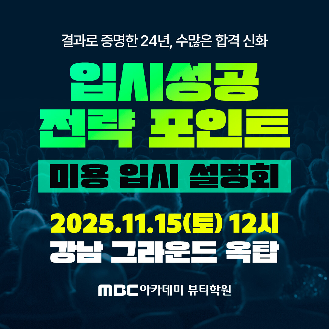 국내 미용 입시 교육의 중심지로 자리매김한 MBC아카데미뷰티학원 강남캠퍼스가 오는 11월 15일(토), 예비 고3 및 수험생을 대상으로 합격솔루션 대학 입시설명회를 개최한다고 밝혔다.