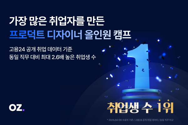 IT 교육 전문기업 오즈코딩스쿨은 자사의 부트캠프 프로그램 ‘디자이너 올인원 캠프’가 누적 취업생 수 1위를 기록했다고 26일 발표했다. 이번 성과는 고용24 공개 취업 데이터 기준으로, 동일 직무 대비 최대 2.6배 높은 취업생 수를 배출한 결과다.