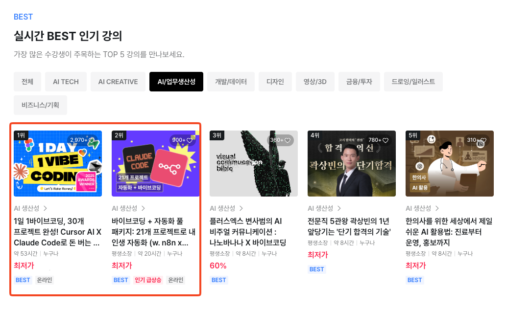 AX·AI 전문 개발사 대모산개발단이 국내 직무 교육 플랫폼 패스트캠퍼스에서 운영 중인 ‘바이브코딩 기반 AI 자동화(n8n)’ 교육 과정이 AI/업무생산성 분야에서 실시간 인기 강의 상위권을 유지하고 있다.