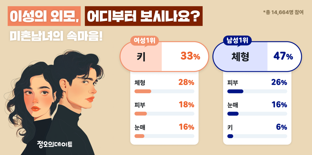 국내 대표 데이팅 앱 정오의데이트가 미혼 남녀 14,664명을 대상으로 설문조사를 진행한 결과, 남녀가 이성을 볼 때 집중하는 외모 포인트는 뚜렷한 차이를 보였다.