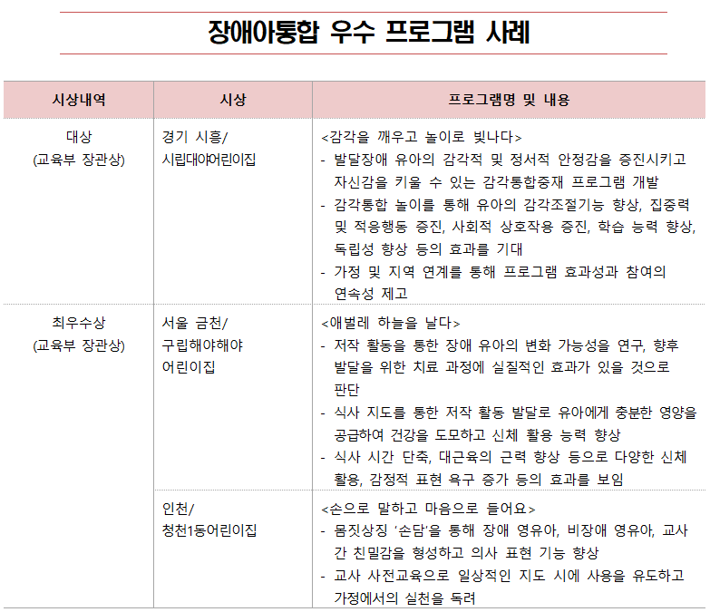 최우수상은 두 개의 프로그램이 수상했다. 서울 금천구 구립해야해야어린이집의 ‘애벌레 하늘을 날다’는 중증 장애아동이 자연스럽게 음식물을 섭취하고 식사 활동을 즐길 수 있도록 돕는 데 초점을 맞췄다. 이를 통해 유아의 신체적·심리적 발달을 도모하며, 장애아동에게 안정적인 일상생활의 기회를 제공했다.
