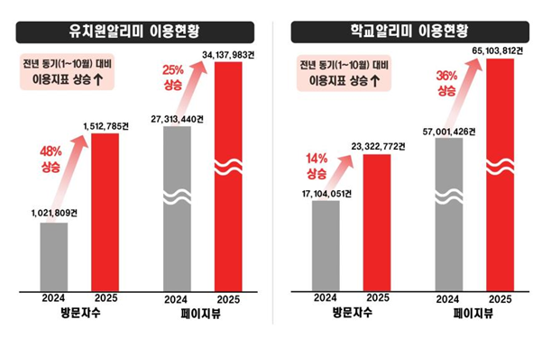 접근성 확대를 위한 노력도 단행됐다. 지난해 9월부터는 전국 시도교육청 누리집에 유치원알리미와 학교알리미로 연결되는 배너가 게시되며 시민들의 접근 경로가 다양화되었다. 이러한 조치로 올해 알리미 방문자 수는 전년 동기 대비 37% 증가했고, 페이지 조회수(Page View)는 17.7% 증가하는 등 서비스 이용량도 꾸준히 늘었다.