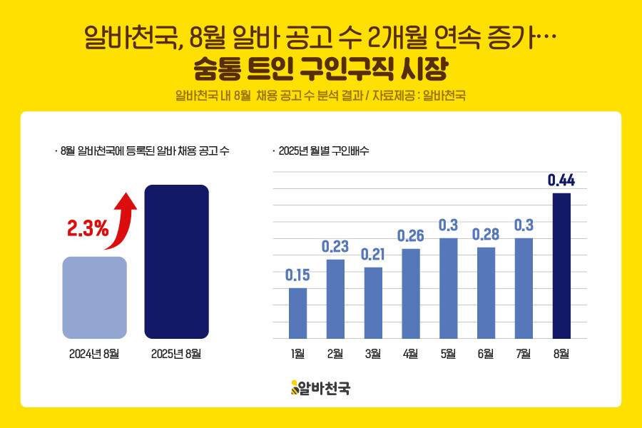 알바천국이 공개한 구인·구직 데이터에 따르면, 8월 등록된 알바 채용 공고는 지난해 같은 달보다 2.3% 증가했다. 상반기 내내 이어졌던 전년 동월 대비 감소세가 7월(+5.9%)에 반등한 데 이어 두 달 연속 상승세다. 전월과 비교해서도 17.6% 늘어나 뚜렷한 회복 흐름을 보였다.