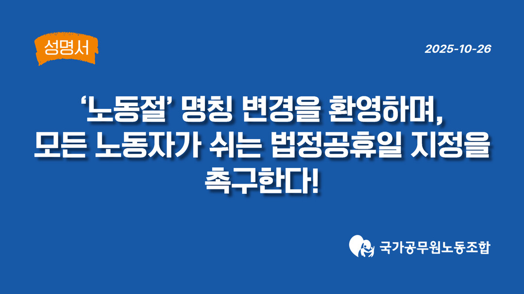 노조는 “지금 필요한 것은 말이 아니라 실천”이라며, “이름만 바뀐 노동절이 아니라 모두가 함께 쉬고 기리는 진짜 노동절을 만들어야 한다”고 강조했다. 이어 “국가공무원노조는 노동절의 법정공휴일 지정과 모든 노동자의 권리 보장을 위해 끝까지 함께할 것”이라고 밝혔다.