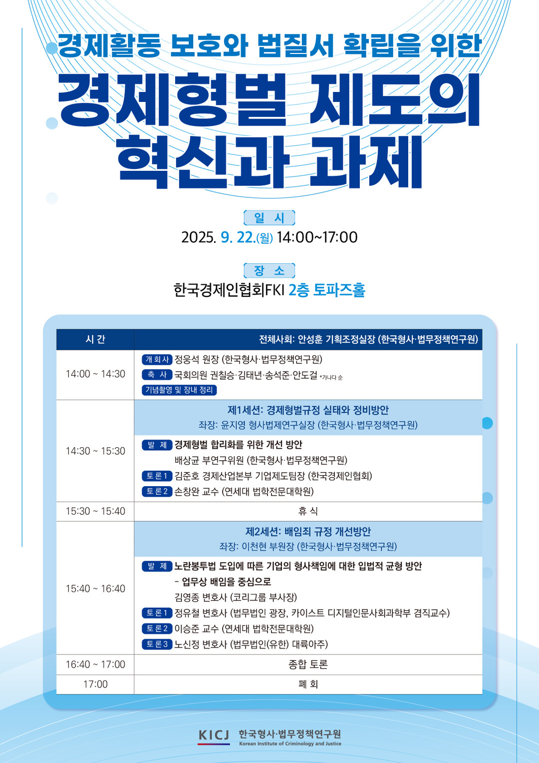 [피앤피뉴스=마성배 기자] 한국형사·법무정책연구원(원장 정웅석)이 오는 9월 22일 오후 2시, 한국경제인협회(FKI) 토파즈홀에서 「경제활동 보호와 법질서 확립을 위한 경제형벌 제도의 혁신과 과제」를 주제로 세미나를 연다.