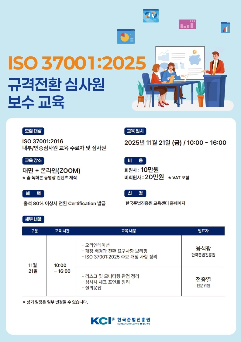 한국준법진흥원(KCI)은 11월 21일 오전 10시부터 오후 4시까지 ‘ISO 37001:2025 규격전환 심사원 보수교육’을 실시한다고 밝혔다. 교육은 대면과 온라인(ZOOM) 방식으로 진행되며, ISO 37001:2016 과정을 수료한 심사원과 현업에서 활동 중인 심사원을 주요 대상으로 한다.