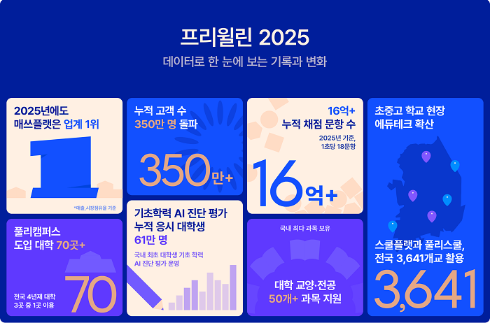 에듀테크 스타트업 프리윌린(대표 권기성)이 2025년 한 해 동안의 주요 성과를 담은 연말 결산 실적을 발표했다. 프리윌린은 자사의 핵심 서비스인 매쓰플랫, 스쿨플랫·풀리스쿨, 풀리캠퍼스를 중심으로 초중고부터 대학에 이르기까지 교육 현장 전반에서 AI 기반 학습·평가 서비스의 활용 범위를 본격적으로 확대하며 성장세를 이어갔다.
