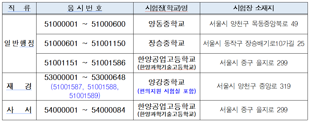 시험장은 응시번호별로 지정되며, ▲일반행정 직류는 양동중학교·장승중학교·한양공업고등학교, ▲재경 직류는 양강중학교, ▲사서 직류는 한양공업고등학교에서 각각 시험을 치른다. 본인에게 지정되지 않은 시험장에서는 응시가 불가능하다.