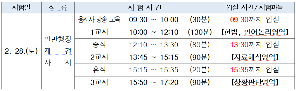 시험은 일반행정·재경·사서 직류를 대상으로 진행되며, 오전 10시부터 오후 5시 20분까지 3교시에 걸쳐 실시된다.