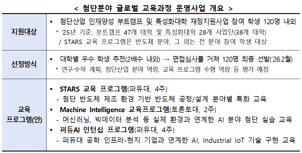 이번 사업은 교육부가 기존에 운영해 온 ‘첨단산업 인재양성 부트캠프’와 ‘첨단산업 특성화대학 재정지원 사업’ 참여 학생 가운데 우수 인재를 대상으로 2026년부터 새롭게 도입되는 프로그램이다.
