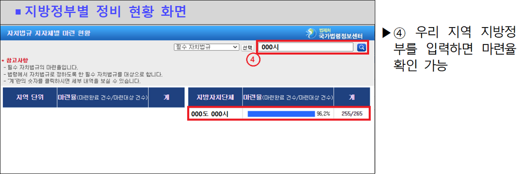 국가법령정보센터에서는 지역별 필수 자치법규 마련 현황을 누구나 직접 확인할 수 있다.