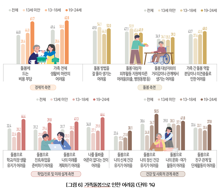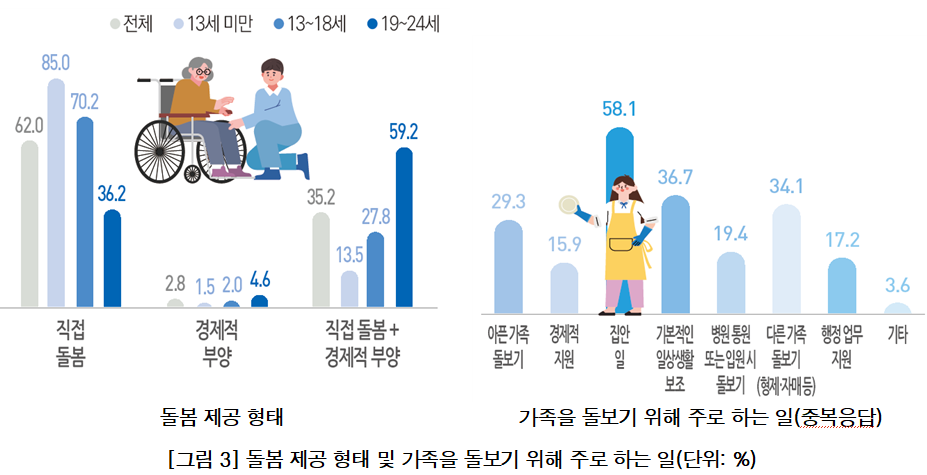 돌봄 내용도 단순 보조를 넘어 집안일(58.1%), 일상생활 지원(36.7%), 형제 돌봄(34.1%), 환자 돌봄(29.3%) 등으로 광범위했다.