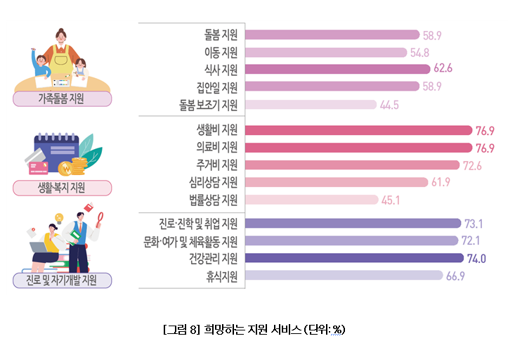 지원 수요는 경제적 지원에 집중됐다. 생활비와 의료비 지원이 각각 76.9%로 가장 높았고, 건강관리(74.0%), 진로·취업 지원(73.1%), 주거비 지원(72.6%)이 뒤를 이었다.