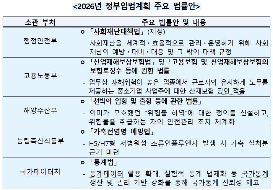 [피앤피뉴스=마성배 기자] 정부가 국민 안전과 삶의 질 향상을 핵심으로 한 대규모 입법을 예고했다. 사회재난 대응 체계 구축부터 산업재해, 해상 안전, 가축 전염병, 국가 통계 신뢰성 강화까지 전 분야에 걸친 법률 정비가 추진된다.