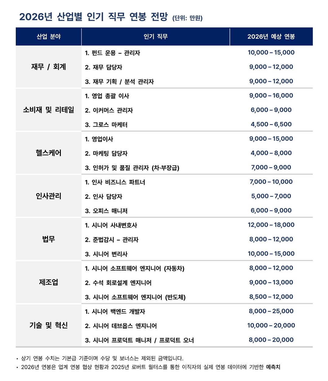 이번 조사는 로버트 월터스 코리아를 통해 구직 활동을 했거나 진행 중인 산업별 재직자를 대상으로 이뤄졌으며, 산업별 채용 동향과 함께 2026년 예상 연봉 범위를 제시했다.