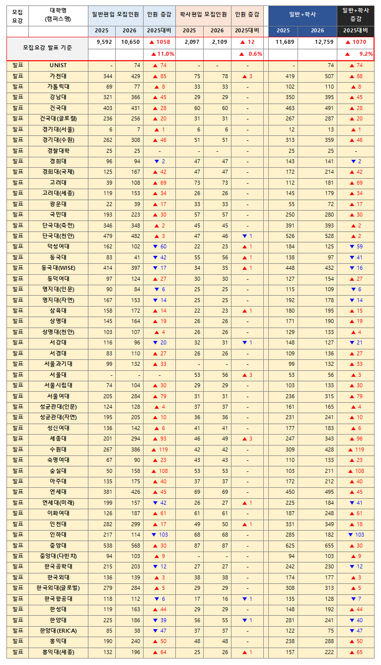 2026학년도 대학편입 시장의 흐름이 대입 판도에 큰 변화를 불러오고 있다. 대학들의 편입 모집요강을 보면, 2026학년도 주요 대학의 편입학 모집 인원이 전년보다 1천 명 이상 증가하며 어느 때보다 전략적인 대입 설계가 중요해졌다.