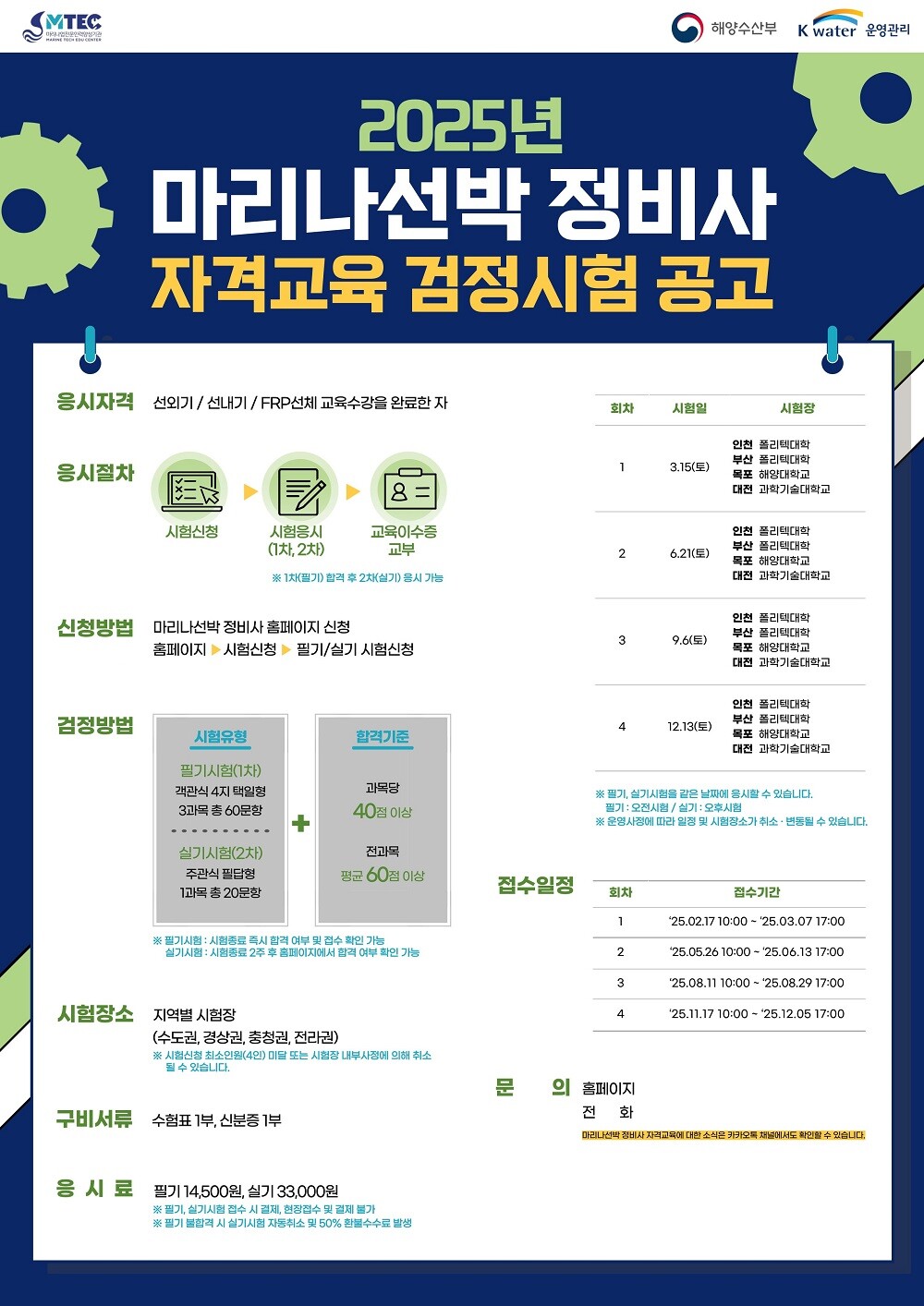 케이워터운영관리㈜는 2025년 ‘마리나선박정비사 자격교육 검정시험’의 올해 마지막 회차를 오는 12월 13일에 진행한다고 밝혔다. 이번 시험의 접수 기간은 11월 17일부터 12월 5일까지다.