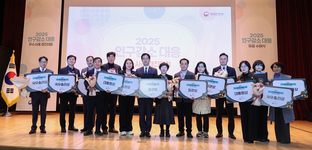 ▲김민재 행정안전부 차관이 18일 오후 정부세종청사 15동 대강당에서 열린 ‘2025년 인구감소 대응 우수사례 경진대회’에서 지역균형발전과 지역활성화에 기여한 기관·개인에게 ‘인구감소 위기 대응 유공’ 포상을 수여한 뒤 수상자들과 기념촬영을 하고 있다.(사진: 인사혁신처)
