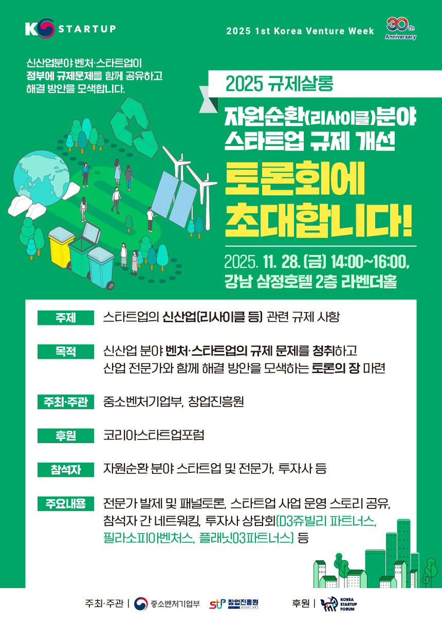 중소벤처기업부(장관 한성숙)와 창업진흥원(원장 유종필)은 오는 11월 28일(목) 오후 2시, 서울에서 ‘신산업(자원순환 등) 스타트업 규제토론회’를 개최한다고 밝혔다.