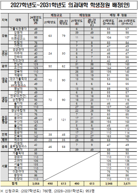 배정안에 따르면 전국 40개 의과대학 총정원은 2024학년도 기준 3,058명에서 2027학년도 3,548명으로 늘어난다. 현행보다 490명이 많다. 이후 2028학년도부터 2031학년도까지는 매년 3,671명 규모로 운영돼 현재보다 613명 많은 수준이 유지된다.