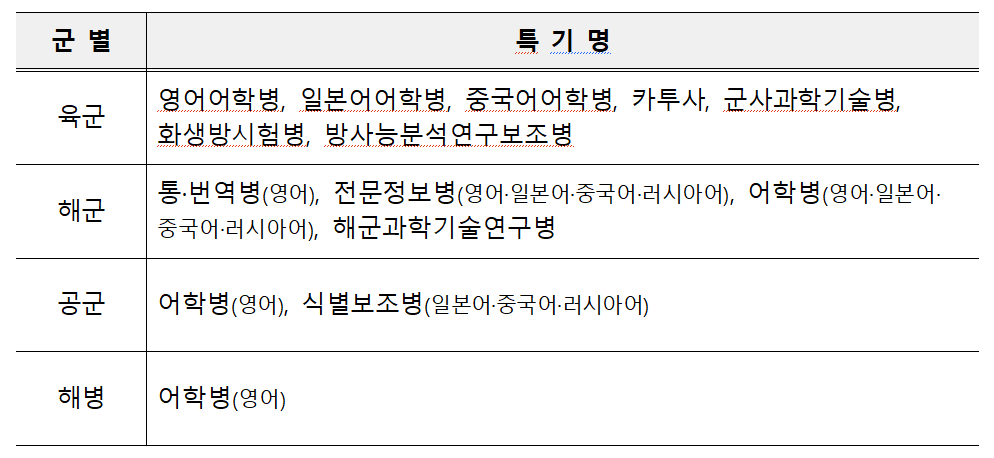 해군은 영어 통·번역병과 전문정보병, 영어·일본어·중국어·러시아어 어학병, 해군과학기술연구병에 적용된다. 공군은 영어 어학병과 일본어·중국어·러시아어 식별보조병, 해병대는 영어 어학병이 대상이다.