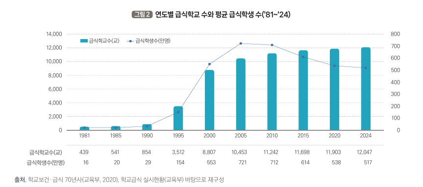 자료에 따르면 급식 제공 학교 수는 1981년 439곳에서 2024년 12,047곳으로 늘었다. 44년 동안 11,600여 개 학교가 증가했다.