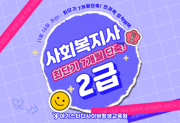 교육부 평가인정 학점은행제 원격교육기관인 여기스터디사이버평생교육원은 내달 16일 올해 2학기 마지막 사회복지사 2급 자격증 취득과정을 개강하고 수강생을 모집한다고 밝혔다. 수강신청은 홈페이지를 통해 가능하다.