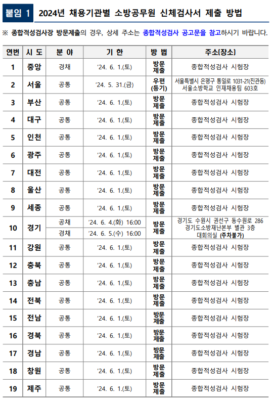 붙임 1. 2024년 채용기관별 소방공무원 신체검사서 제출 방법 1부.