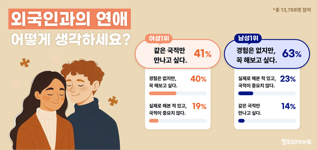 이번 조사는 외국인과의 연애가 점차 일상적인 선택지로 자리 잡고 있지만, 성별에 따라 인식 차는 여전히 뚜렷하다는 점을 보여준다.