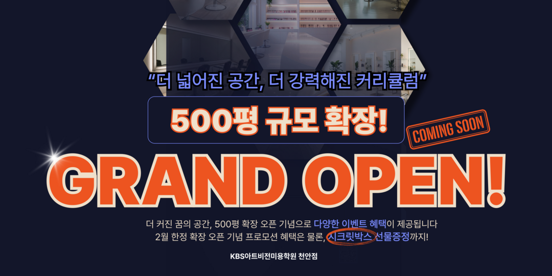 KBS아트비전미용학원 천안점이 오픈 2년 반 만에 500평 규모 확장을 확정하며, 보다 체계적인 미용 전문 교육센터로 도약한다.
