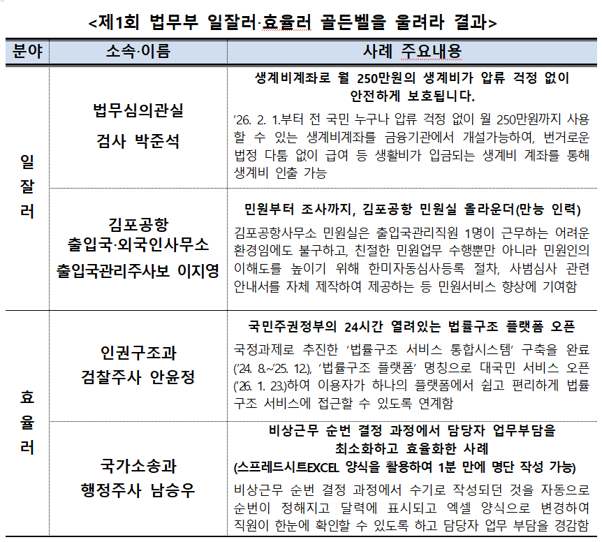 제도에서 말하는 ‘일잘러’는 적극적인 업무 수행을 통해 눈에 띄는 성과를 낸 직원을, ‘효율러’는 보여주기식 행사를 줄이고 불필요한 문서를 감축하거나 대국민 편의성을 높이는 등 효율적인 방식으로 업무를 개선한 직원을 뜻한다. 법무부는 이 제도를 격주로 운영해 우수 사례를 지속적으로 발굴할 계획이다.