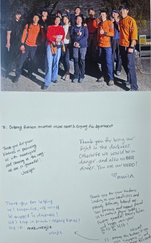 9일 경기도북부소방재난본부에 따르면 지난해 11월 북한산에서 조명 장비 없이 야간 하산을 시도하다 조난된 싱가포르 국적 관광객 4명이 지난달 말 고양소방서에 손편지를 보냈다. 등산 경험이 많지 않고 복장과 장비도 충분하지 않았던 이들은 오후 7시쯤 북한산 약수암 쉼터 인근에서 고양소방서 산악구조대에 발견돼 모두 무사히 하산했다.