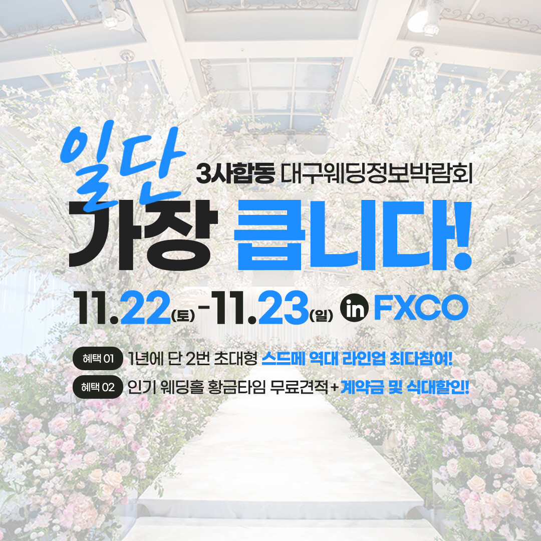 겨울 시즌을 앞두고 대구웨딩박람회가 11월 22일(토)~23일(일) FXCO에서 열린다. 웨딩스타 주최, 대구웨딩정보센터·예연 후원으로 진행되며, 지역 최대급 규모의 원스톱 비교전을 표방한다.