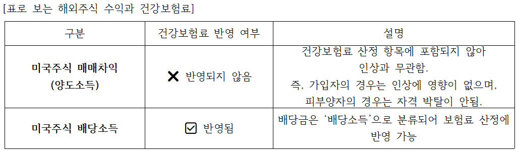 다만 여기서 주의할 점이 하나 있다. 바로 배당소득이다. 미국 주식에서 받는 배당금은 명확히 ‘배당소득’으로 분류되며, 이는 건강보험료 산정에 반영된다. 직장가입자의 피부양자 자격 요건에도 영향을 줄 수 있고, 지역 가입자의 경우 보험료가 실제로 오를 수도 있다. 즉, 매매차익은 안전하지만, 배당은 예외라는 점을 기억해야 한다.