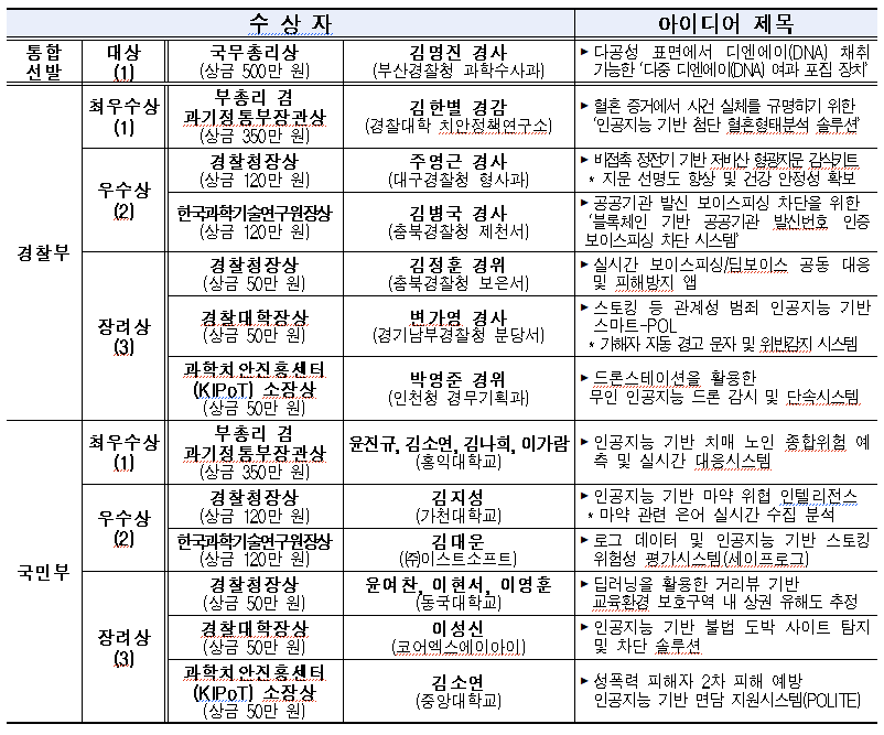 경찰부 최우수상(부총리 겸 과기정통부 장관상) 은 치안정책연구소 김한별 경감이 제안한 ‘AI 기반 첨단혈흔형태분석 솔루션’, 국민부 최우수상은 홍익대 윤진규 씨가 제안한 ‘AI 기반 치매노인 위험 예측·대응 시스템’이 수상했다. 이외에도 우수상 10건(경찰청장상·KIST원장상) 이 선정됐다.