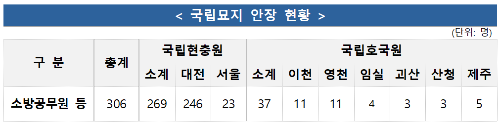 2025년 현재 국립현충원과 국립호국원 등 국립묘지에는 총 306위의 순직 소방공무원이 안장되어 있으며, 이 중 국립대전현충원 소방공무원 묘역에는 246위가 잠들어 있다.