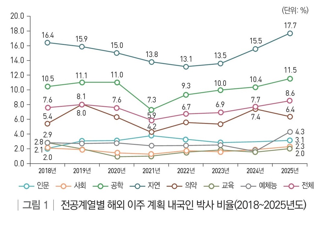 2025년 기준 자연계열 신규 박사의 17.7%가 해외 이주 계획을 갖고 있는 것으로 조사됐다. 전체 계열 가운데 가장 높은 비중이다. 공학계열은 11.5%로 두 번째로 높았다.
