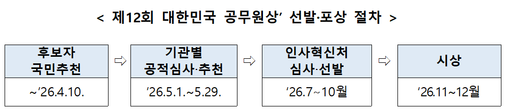 최동석 인사혁신처장은 “대한민국 공무원상을 통해 국민의 삶을 개선하는 데 기여한 공직자의 노력을 확인해 왔다”며 “국민과 함께 호흡하며 성과를 낸 공무원이 발굴될 수 있도록 많은 국민이 추천에 참여해 주길 바란다”고 말했다.