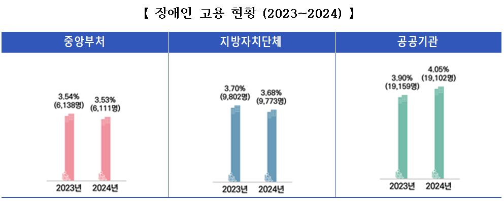 장애인 고용률은 중앙부처(3.53%)와 지자체(3.68%)가 소폭 하락했으나, 공공기관은 4.05%로 전년 대비 0.15%p 올랐다. 특히 중증 및 여성 장애인 비율은 모든 영역에서 증가해 공직 내 취약계층 고용 기반이 넓어졌다.