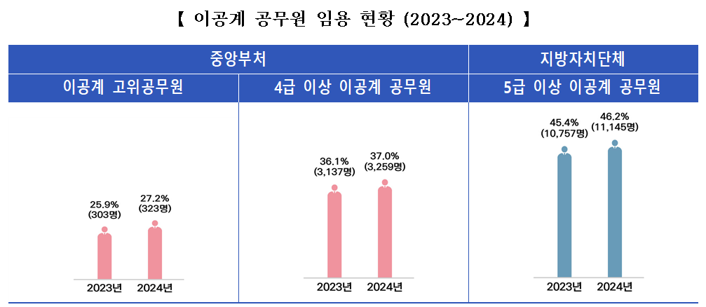 이공계 출신 고위공무원은 27.2%, 4급 이상 공무원은 37.0%로 매년 꾸준히 증가했다. 지자체 5급 이상 공무원의 이공계 비율도 46.2%로, 임용 목표(40%)를 지속 상회하고 있다.