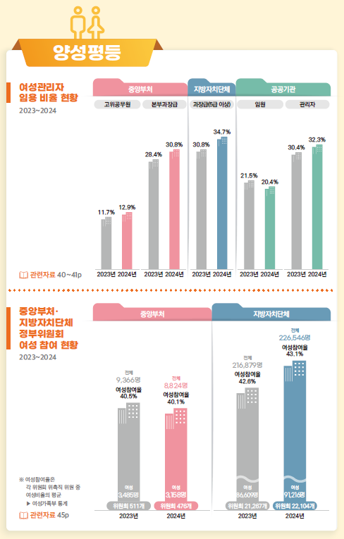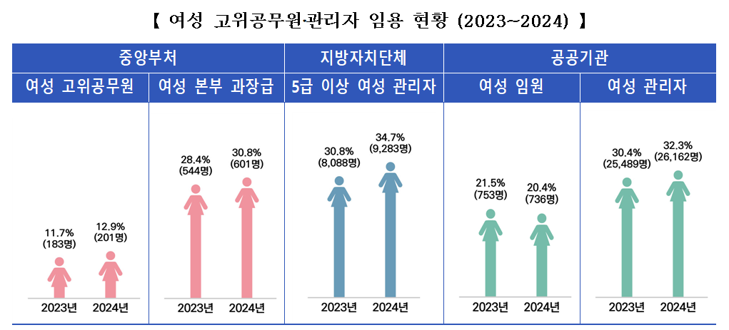 특히 중앙부처 본부 과장급 여성 비율은 30.8%로 사상 처음 30%대를 기록했으며, 문화체육관광부·여성가족부·외교부·법제처·질병청·통계청 등 6개 기관은 과반이 여성으로 나타났다. 지자체 역시 5급 이상 여성 비율이 34.7%로 2년 연속 30%대를 유지했다.