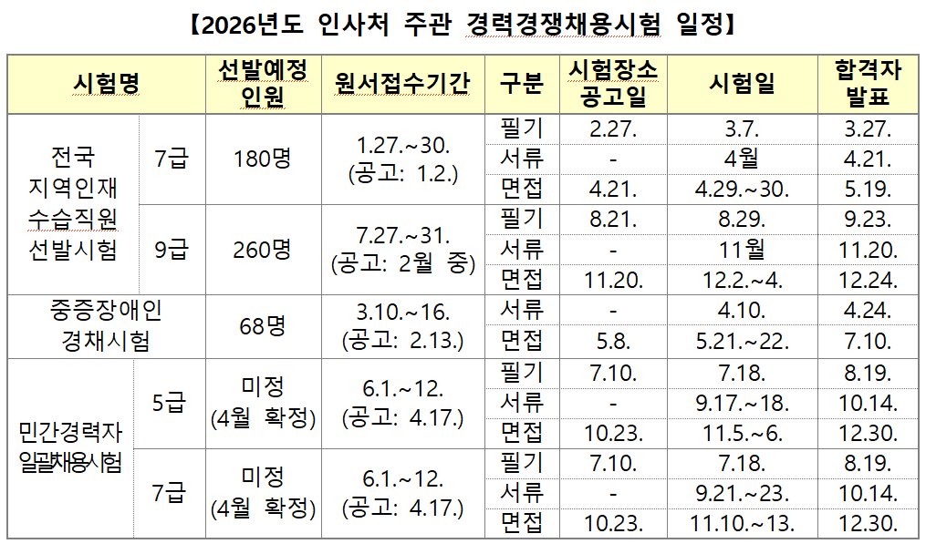 인사처가 주관하는 경력채용은 7급 지역인재 선발을 시작으로 연중 순차적으로 진행된다. 7급 지역인재 시험은 1월 27일부터 31일까지 원서 접수를 진행하며, 3월 7일 필기시험, 4월 서류전형, 4월 29~30일 면접을 거쳐 5월 19일 최종 합격자를 발표한다.