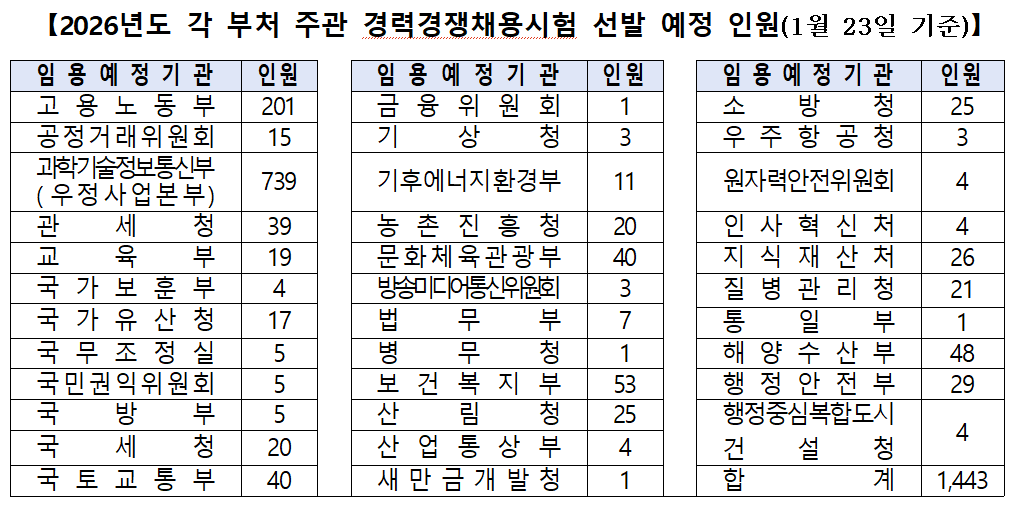 1월 23일 기준 채용 일정이 확정된 부처는 고용노동부와 과학기술정보통신부, 국토교통부, 보건복지부, 국세청 등 34개 기관이며, 이들 부처에서 선발 예정인 인원만 1,443명에 달한다. 아직 채용 계획이 확정되지 않은 부처까지 포함하면 올해 전체 경채 선발 규모는 더 늘어날 전망이다.