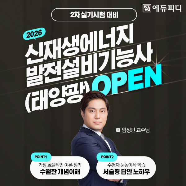 임정빈 교수는 “신재생에너지발전설비(태양광) 기능사 실기 시험은 시스템의 원리와 부품의 설치 및 점검 방식에 대한 개념을 서술형으로 풀어 작성하는 시험이기 때문에 학습한 내용의 정확한 숙지와 답안 작성 연습이 중요하다”라며 “태양광 발전 시스템의 명칭, 기능, 역할, 작동 원리를 정확히 암기하고 서술형 답안으로 풀어내는 노하우를 전하는 ‘에듀피디 실기패키지’로 안정적인 합격을 준비하길 바란다”고 전했다.